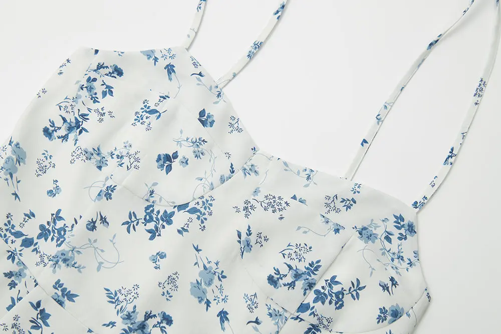 Detail: Adjustable shoulder ties, sweetheart neckline, botanical print, concealed back zipper