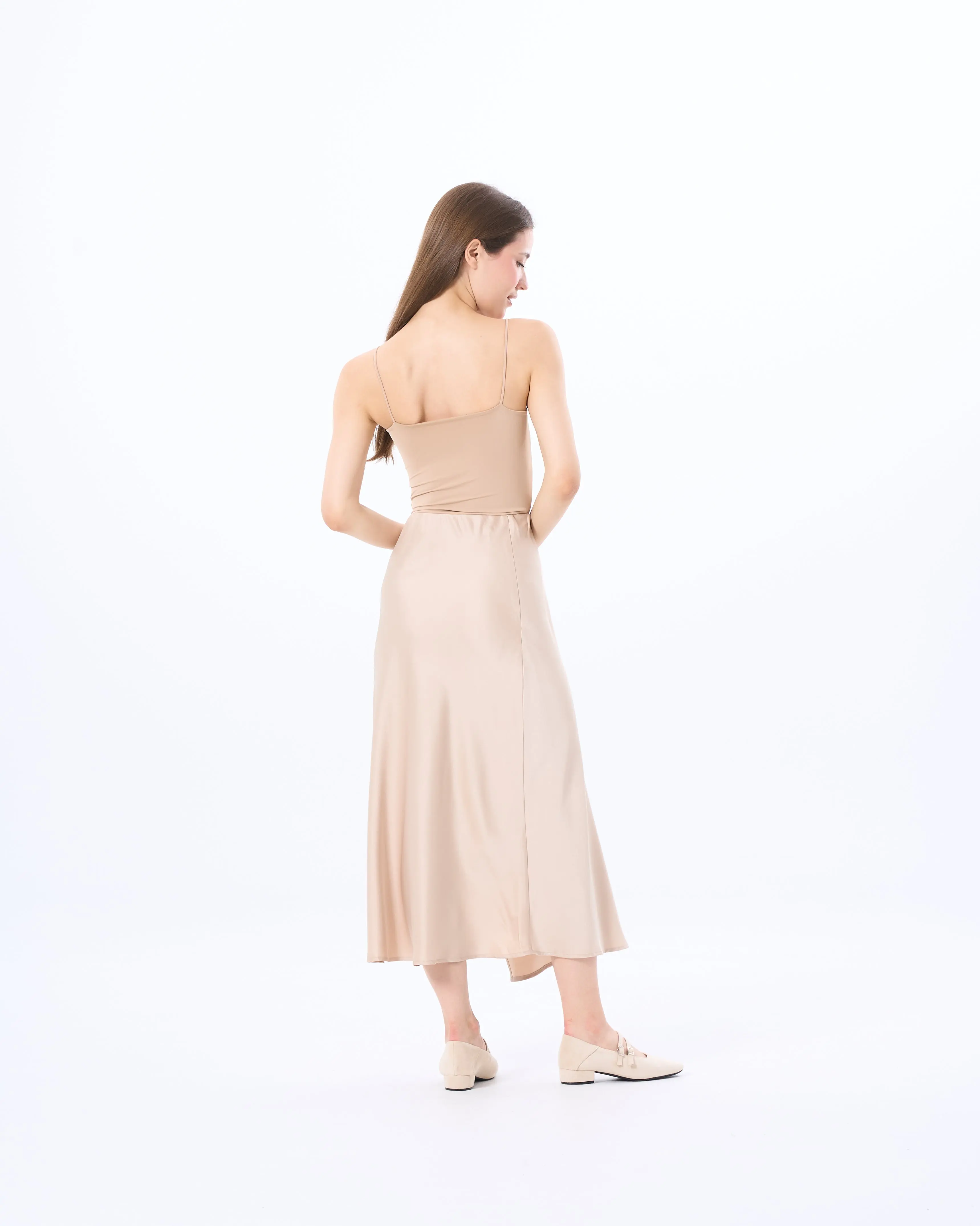 This silky midi skirt combines the elegance of a wrap style with the ease of a pull-on. The structured design opens up a chic side slit at the hem, creating a stylish side split that allows for easy walking and dynamic movement. Soft to the touch and lightweight, and available in three neutral staples—Black, Khaki, and Beige—it is a versatile piece for work or weekend outings.