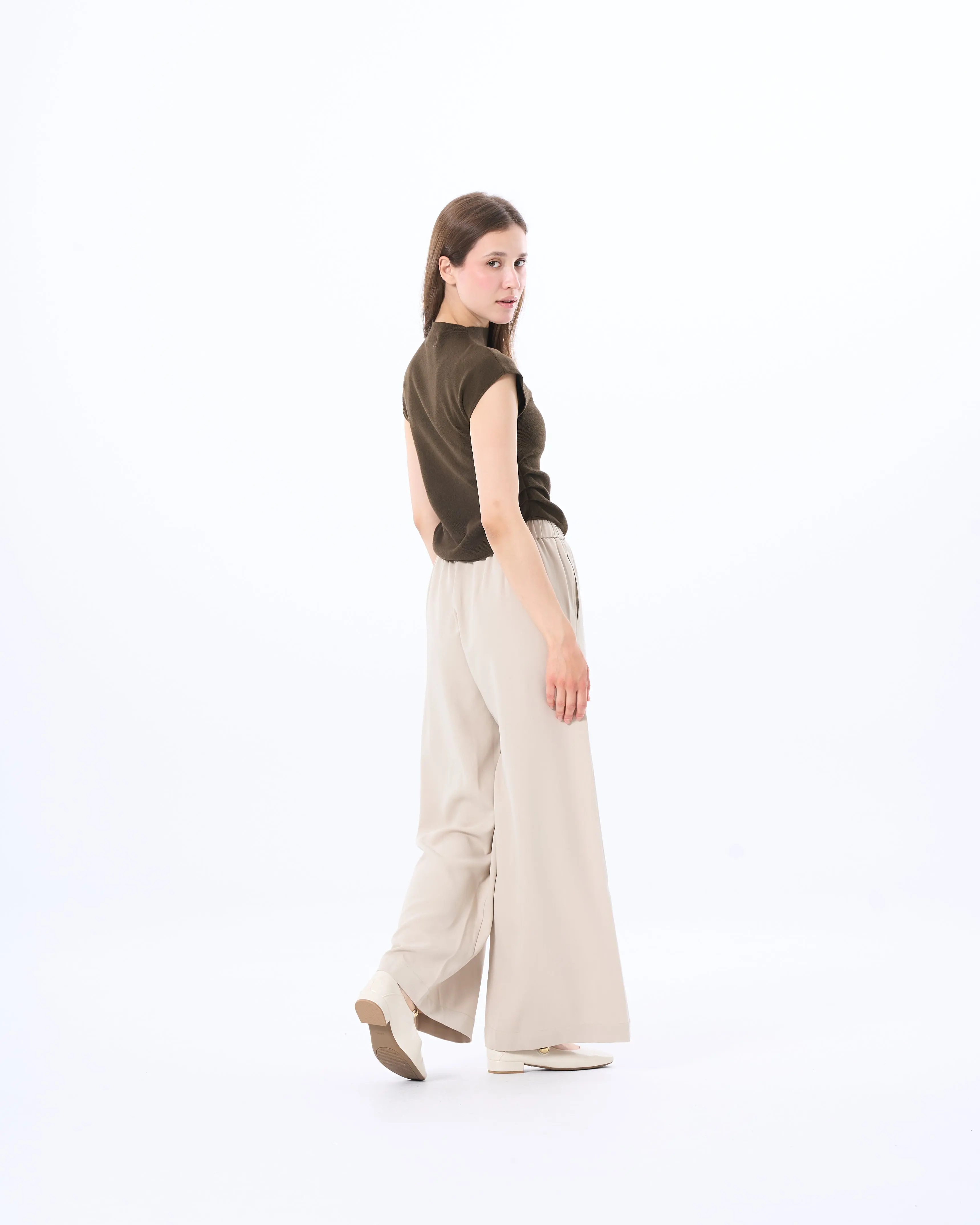 The beauty of this layering piece lies in the silhouette. Designed with delicate side ruched seams, it creates a rippled effect that softens the look and enhances the figure. The extended cap sleeve cut offers just the right amount of shoulder coverage, making it appropriate for office wear or evening outings. Available in three rich neutrals—Almond, Black, and Dark Brown.